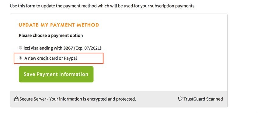 To change your credit card billing information, click My Account > Payment > Manage Payment Methods (or Edit Payment Method). From there, follow the prompts on your screen to add your new payment information. Remember to click 'Save.'