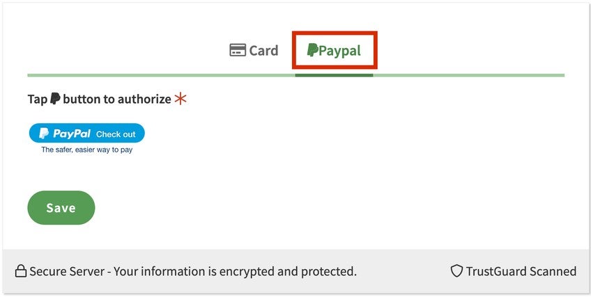 Step 2: Select the Paypal tab, and click the Paypal button. A new window will pop up to validate your account.