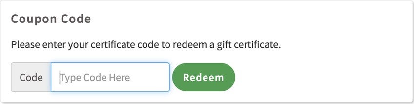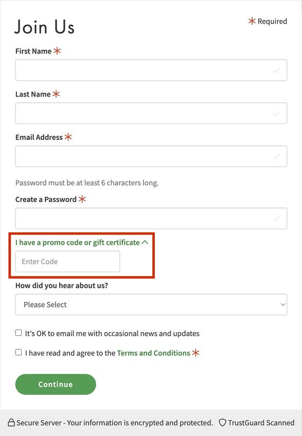 During 'Step 1' of the sign-up process, click 'I have a Gift Certificate or Promo Code.' An empty form field will appear beneath the button. Enter your code in the field before selecting 'Continue.'