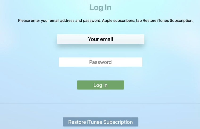 Note: You may be asked to enter your Apple ID if you did not do so when you first set up your Apple TV. You will also want to select "Restore iTunes Subscription", if you created your original Pilates Anytime account through Apple. If you created your account through our website, please disregard this option.