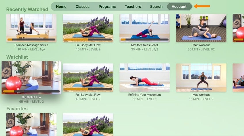 Your Watchlist Save a video to your "Watchlist" (or queue) from any device using the Pilates Anytime app (including iPad and iPhone), and the videos will appear in your Apple TV Watchlist (under the Account tab in the Apple TV app). Learn more about downloading our app on the iPhone and iPad