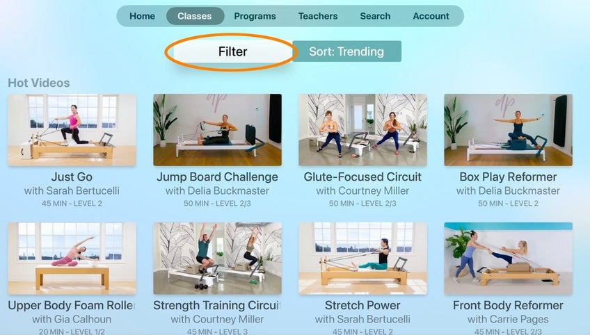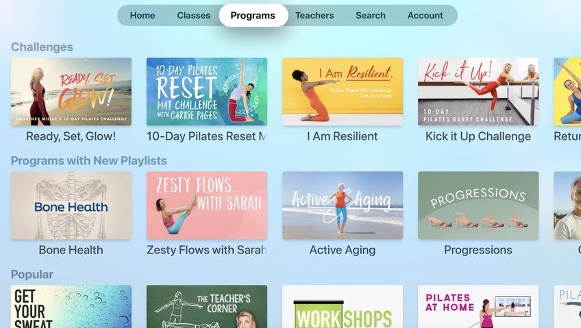 Programs Click the 'Programs' tab to browse programs. Each program has playlists that contain videos in a specific order. These programs are curated for specific needs to help you find the Pilates practice and progressions that are best for you.