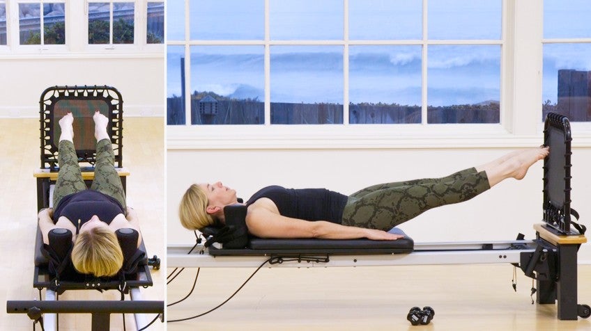 Opening your shoulders. I've got a little work going on in the back of my arms, pressing down against the mat, starting to warm up my triceps and stretch and to stay in parallel. Keeping your back down against the board or back on the carriage press. Really articulate the joints of the feet and jump. Let's just take two more. Okay. All right, so with the three chords felt fairly supportive. I want to start challenging my abdominals now, so just like it would on any of the other equipment when I start taking some tension down. So I'm removing one of those chords.
