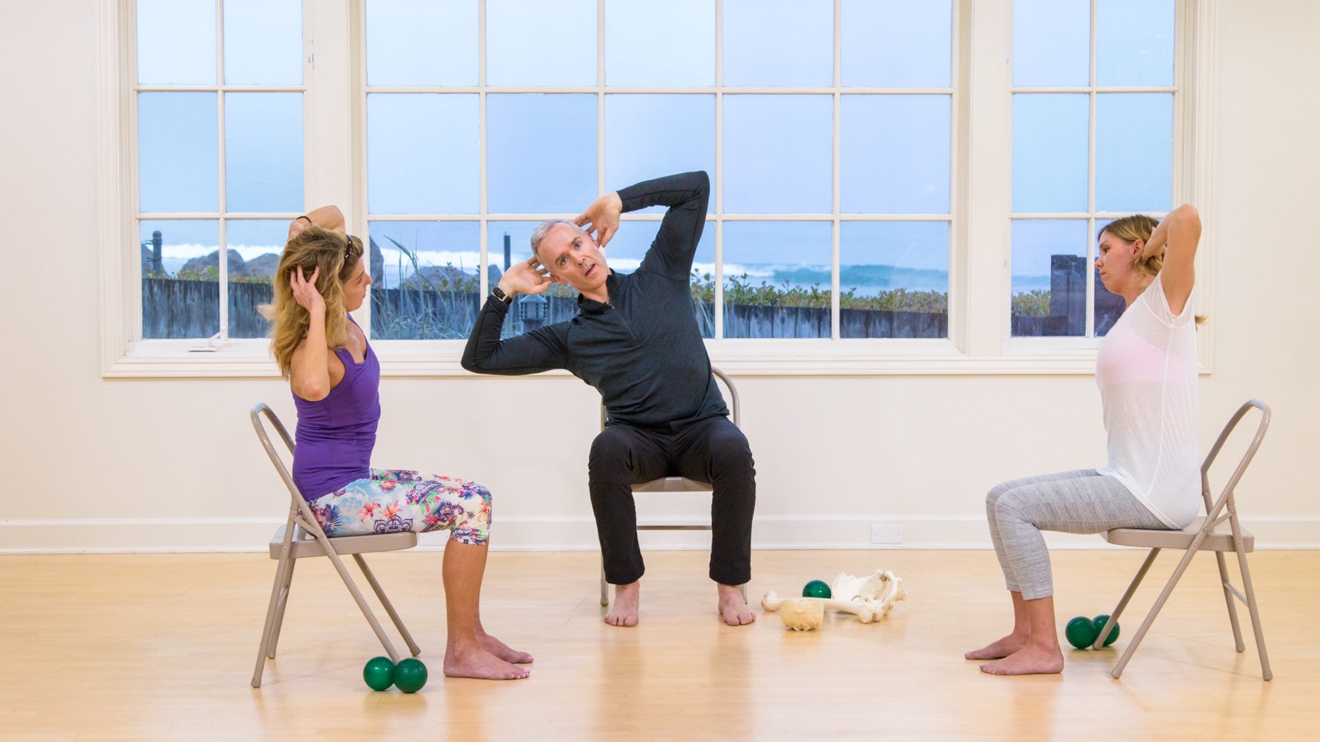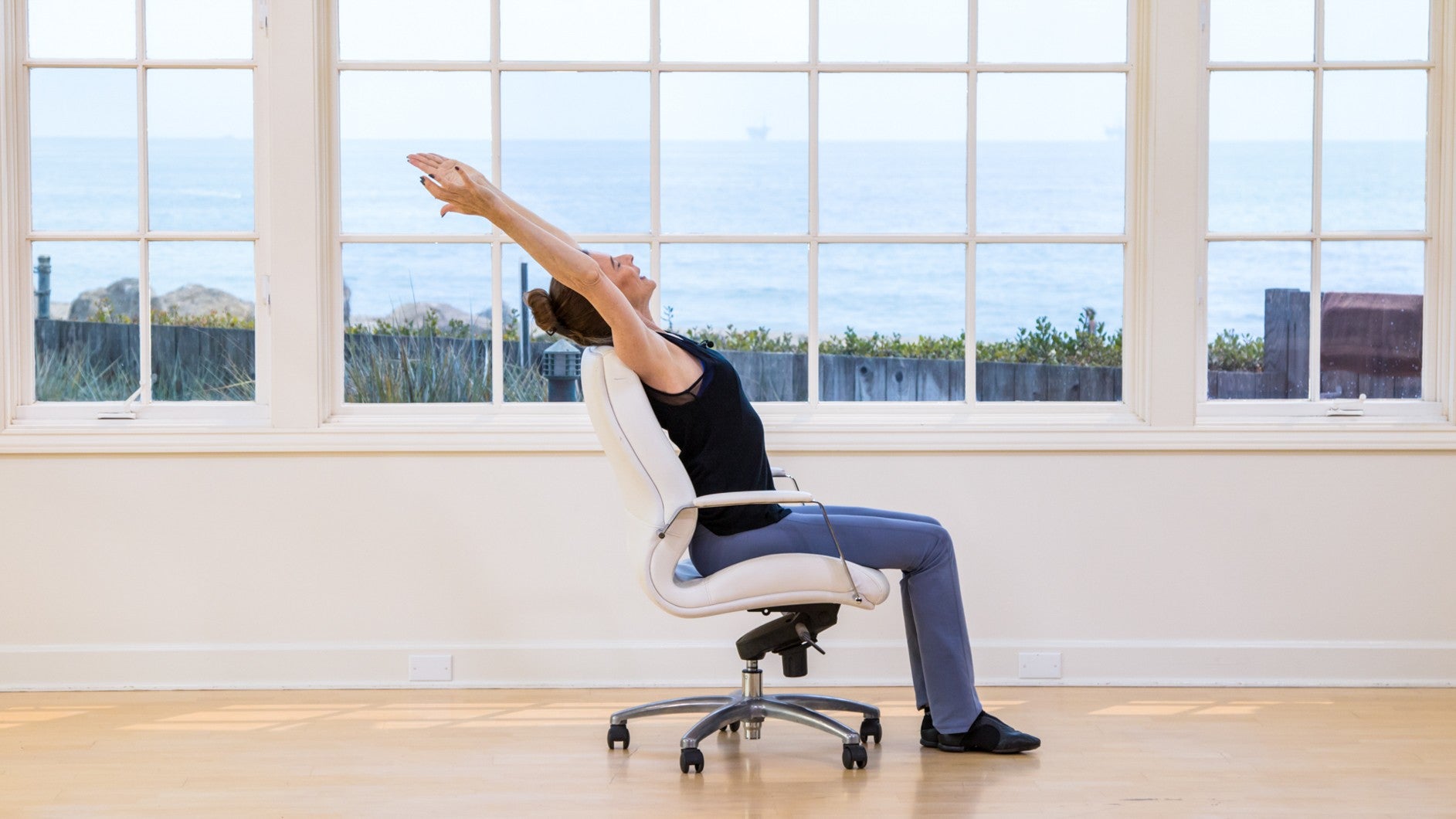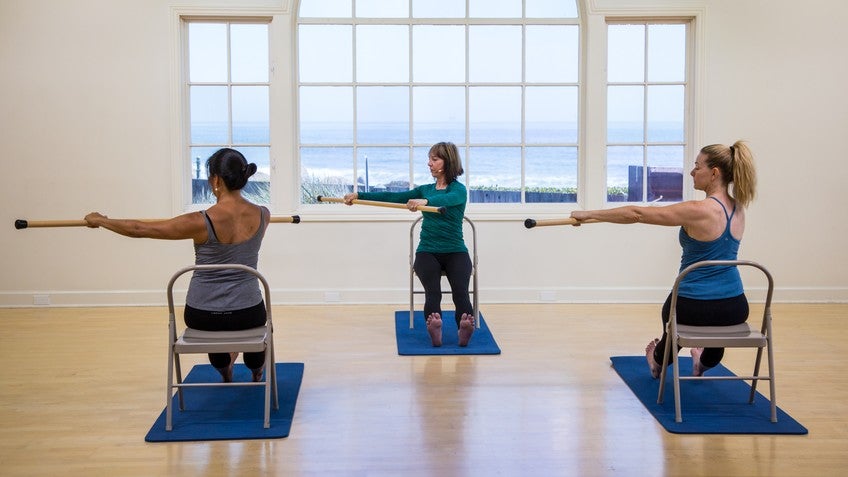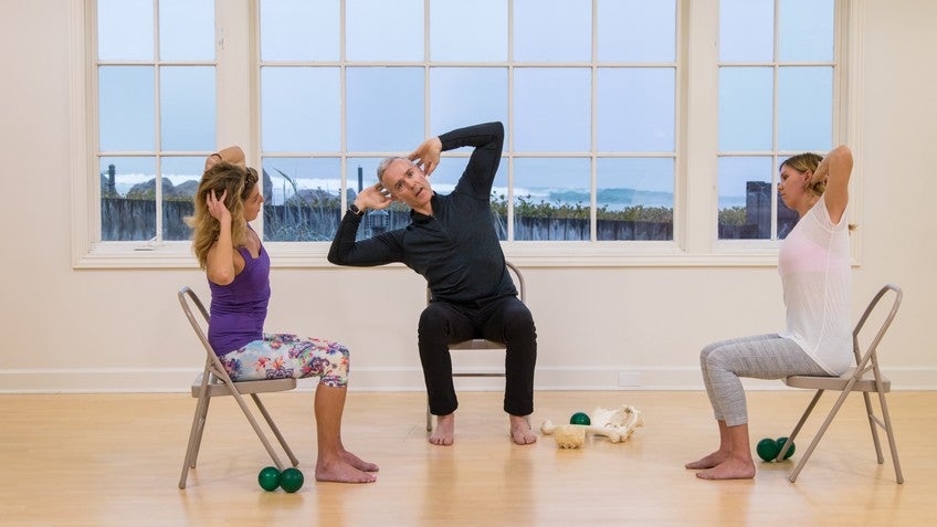 Sit up tall in your chair and place your hands behind your head or across your chest. Inhale to lift the waist and exhale as you slowly rotate your torso to one side. Keep the hips still so that the rotation takes place in the spine. Inhale to prepare, and exhale as you return to center. Repeat three times in each direction.