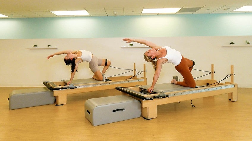 Now we quicken our tempo. We do one, two, three. We push out. We come in, we do one, two, three, four, and into child's pose. (Maria exhales) Step over to the right, bring your foot bar up. Machine is really light.
