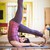 Inhale. (breath out) (two short breaths in) (breath out) (two short breaths in) (breath out) One more. (breath in) (breath out) Hold it there. Now reach one arm forwards, and rotate, it's kinda like a bow and arrow, and then go to the other side. Elbow back, and reach.