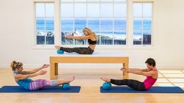 Now, reach the hands over your head, pull your scapula down. Ready? We're gonna roll up. (breath in) Exhale. (breath out) And then extend up, beautiful. Take your ball, and now we're gonna do some side line work, so we're gonna put the ball just underneath your ribcage, and the elbow's gonna go on the mat, and you're gonna lift up. The ball's there just to support you a little bit more, and also have little bit more stability.