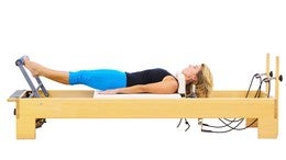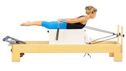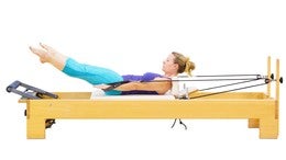 Let's take a look at the backstroke first. We're set on one red spring on the balanced body equipment and you want to make sure that you place yourself on the box in a way that when you roll back, your shoulder blades will be just off the mat. And then here you can bring your legs to tabletop position and pause here for a moment. Next step is to retrieve the straps and then hold them in your hands with a soft fist. So the fist is going to be kind of just above your eyes. The carriage is no longer at the stopper. And here we want to make sure we're in full trunk flection. Nice, good abdominal curl, big focus on abdominals here.