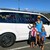 Hold that position in that lovely stretch. Take your hands to the right side. Take your hands to the left side compared to the center, and then slowly roll all the way up. Quickly turn to face the front. We're going to put you right, like in France. Put your right leg and just push your knees out and stretch forwards and that lovely stretch. Take the leg out diagonally forward.