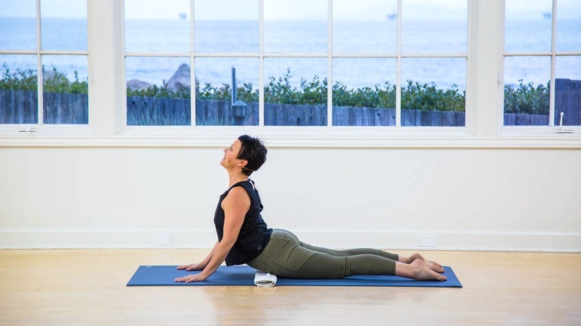 Really smart way to protect your low back is to know how to direct your pelvis in space when you're doing prone exercises. So I'm going to lie down and put this right on my hip creases, right? So we've been working on keeping a nice steady press into the hip creases there.