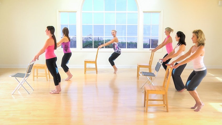 So it's really important that you keep those hips square. Okay? Let's turn to the other side. Ready, diagonally to your chair. Your barre.