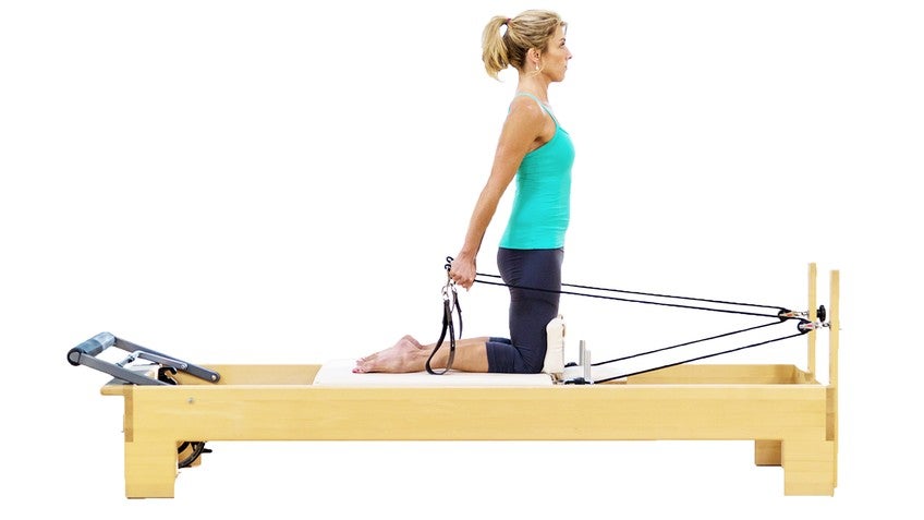 Start Position: Kneel on the carriage with the knees against the shoulder pads, shins pressed down, and the tops of the feet flat against the carriage. Hold onto the straps with a closed fist, above the handle, and palms facing in towards each other. Draw the abdominals to the spine, curl the pelvis under, and rise to kneeling. Maintain a straight line through the front of the body from the neck to the knees. Arms are straight and slightly in front of the body.
