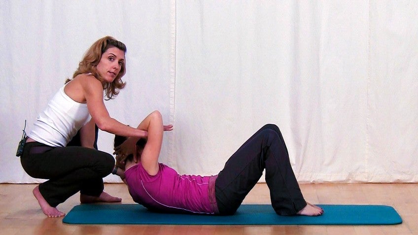 And inhale, I'm just gonna show you a range, she's doin' fine, exhale, shoulder to hip. But it's not that big, inhale, and exhale. This is sort of a precursor to the crisscross that comes later. You'll also see this taught with this flection rotation and even a little bit of lateral flection. So listen to your instructor as to which version they're choosing.