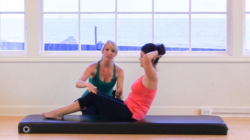 Now we're going to be doing chest stuff with rotation, a modified version for pregnancy here. Fingers are going to go behind the head. Go ahead. So you want to make sure that you're starting nice and lifted into your extension. Again, squeeze in the inner thighs together just to provide that extra sense of stability. Taking the breath into, prepare it with the XL, drawing into the posterior tilt coming back. Excellent. Go. So really feeling that stabilization in the pelvis, preparing with an inhale. Exhale, rotate to the right and help pass through the center and XL to the left.