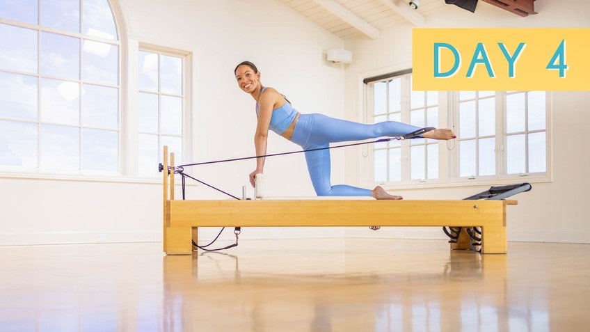 Hi, welcome to Day Four, I'm Gia. And today we're gonna do a Reformer class that's focusing on lengthening your body and still just a little bit of core work as well. We're gonna start with footwork. I have three red springs and one blue or three full and one half, my head rest is up. But you can do whatever feels good to your body and we're gonna start with the prehensile position.
