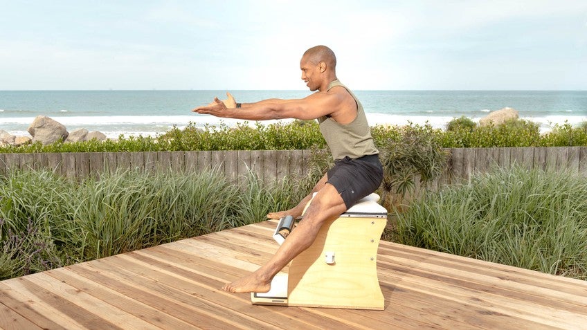 Hi, everyone, I'm Chris Robinson, and I'm here today, to do a full Wunda chair workout. Okay, let's start with the footwork. You're gonna have one spring on the top, one on the bottom. You have some choices here; you can either go parallel and apart or heels together, toes apart. Today, I'm gonna go parallel and apart.