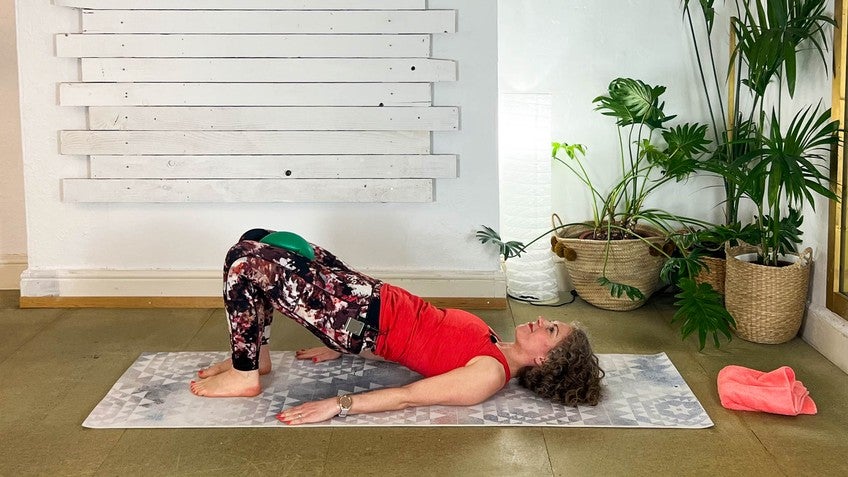 For bridging, you're gonna bring your attention to your tailbone at the very end of your spine, and your sacrum just above it. So instead of clenching your bottom, you're gonna allow your bottom to melt into the mat and talk to your tailbone. Your tailbone's gonna invisibly curl into your pelvis, and then the inside of your sacrum is gonna lift up like a hovercraft lifting. And then you breathe in, and then on your exhale, let your sacrum, let your tailbone go, and come all the way down. I know, that was a lot to think of.