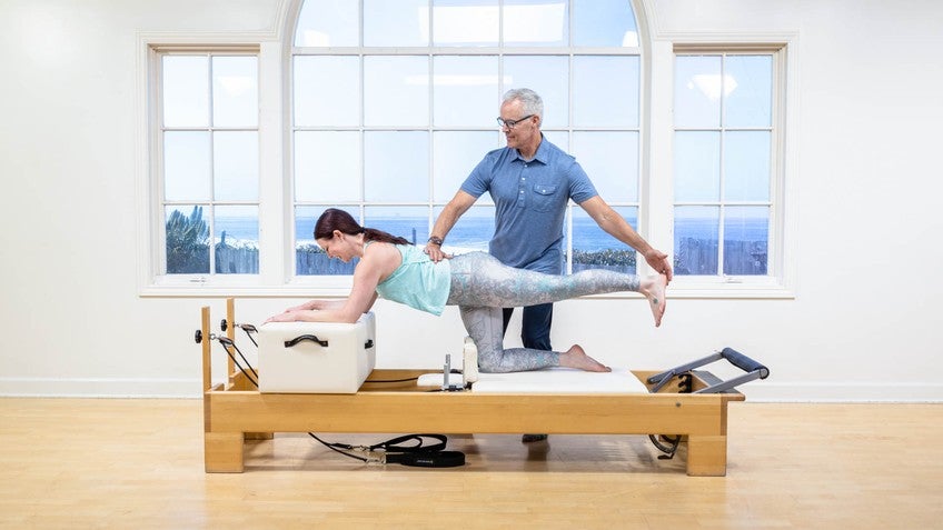 Hi, everybody, I'm Tom McCook. I'm here with Erin and very happy to be back at Pilates Anytime for this functional reformer class. So what you're gonna need to do in the beginning of the class is put your long box on the floor the way we have it. And Erin's gonna be my model today, which I'm very excited about, and she's gonna come in to a flat back position and put her hands on the box. So this start of the class is just to mobilize the spine and the joints of the body, just to get her fluid and organized.