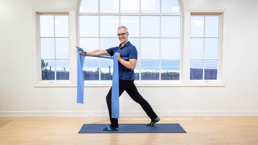 Hi everybody, I'm Tom McCook, back here at Pilates Anytime, very excited to be back. This class today will be a TheraBand and Pilates workout, which will combine some of the Franklin method of function and helping you use your body better, a TheraBand is an amazing tool that you can take anywhere you go and develop full body strength. As we go through, my recommendation is to focus on efficient, fluid movement, and keep your breathing nice and smooth, focus on form over just working hard. So how we're gonna start is, as I want you to stand with your feet about six inches apart, and look down at your feet for a moment and lift all 10 toes off the ground. And as you do that, unlock your knee joints and center your head over your pelvis.