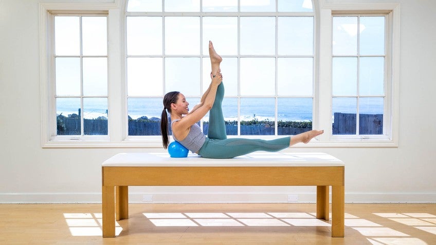 Roll up Articulating through the spine, inhale. Exhale as you roll down. Now, you're gonna roll and hold. Find that nice long position. You're gonna squeeze that ball in and then release.