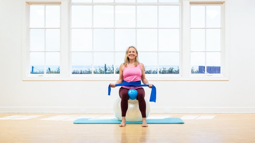 So in this class, we're gonna focus on safe exercises that you can do during pregnancy or again, postpartum to help with your abdominal separation. The props that you'll need are a small Pilates ball, a medium strength resistance band, and either a stability ball or just a chair. So let's get going. You're gonna sit on your stability ball or your chair and just walk your feet forward just a little bit, so you're either right on the edge of your chair or more in the front of the stability ball. Take your small ball and place it in between your inner thighs.