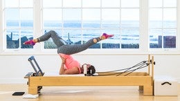 So have some fun with me, and you're gonna get your sweat on, so have a towel close by. You'll also wanna have some water, and for this class, we will be using the resistance band as well as your long box, but we can just forget about that for now. Let's set up our springs for the next flow. So, this is not what we're gonna do right now, but I have two springs on for a bridge series, and I have my bar in mid position, locked in and ready to go. Okay, so we can just transition to that when we're ready.