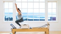 Placing the foot against the shoulder block, reduce your spring so you only have one. Come into your lunge position. Exhale, round the lower back. So scoop the belly in as the knee crosses. Land and open.