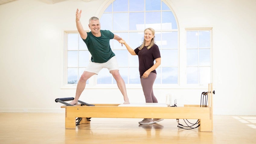 Hello, I'm Sally Anderson. Thank you for joining me for a reformer class focusing on hydration or achieving better whole-body tissue hydration. Andrew Aroustian is here to help by demonstrating for me. And we're going to have a focus on pace, pump, bit of twisting, those things that help move fluid and hydration through the body. So we're going to start with the foot bar down and the long box on.