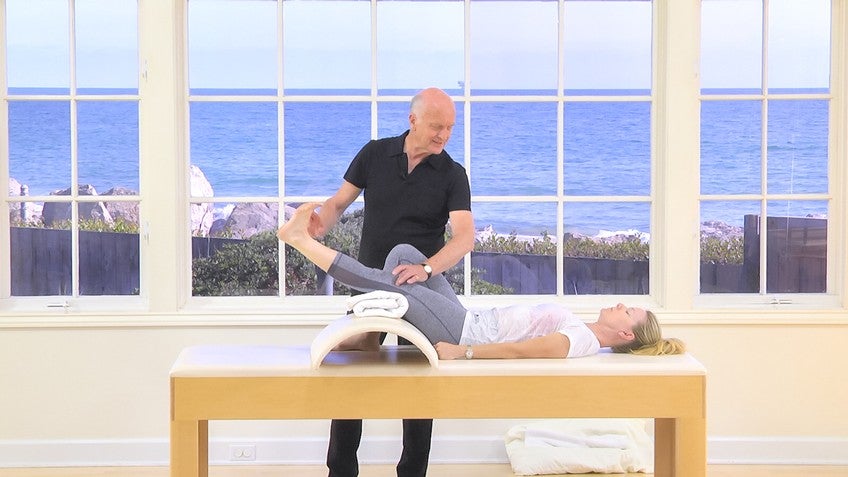 I never work the quadriceps first. I always start from the back of the leg, then the inside and then the front so that when you start to work with the front leg, the quadriceps, you have the support of the hamstrings and the glutes. So what we're going to do is, first of all, we're just going to show you a couple of things lying on the front too. To get the back of the legs working to end. If you'd like to lie on your front and play, what I'd normally do is if someone's going to do remedial work on their legs, they need to do more than just eight or 10 particularly if there's a problem you need to do sometimes 30 so if you've got someone lying on their front for that amount of time, you need to support the lumbar spine.