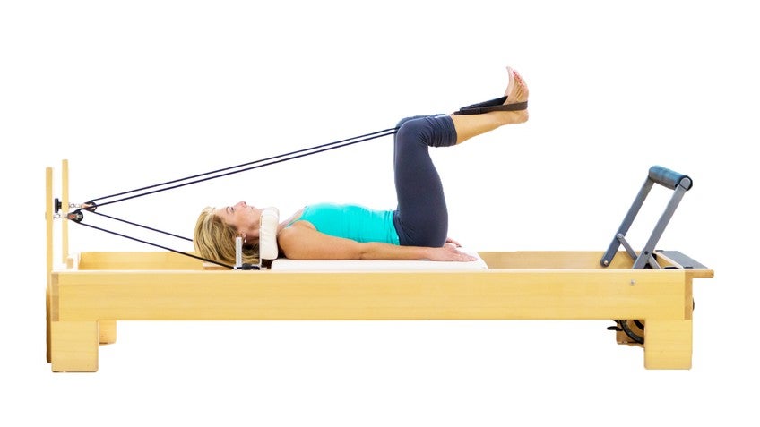 Hi, I'm Sarah, and we're going to take a look today at putting the legs in straps. I've got Christie set on one red and one blue spring, and it's important to remember that if you adjust the spring lighter or heavier, it will feel different. In some ways it will be easier and in other ways it will be harder. So you should use the spring that feels right to you, but I definitely don't recommend going too heavy, nor do I really recommend going to light just to make sure that you feel safe and comfortable in this series of exercises. First, it's important that you pay attention how to get safely put your feet safely in the straps. And the way I like to teach it is to first ask the first, ask my clients to retrieve the straps from the pegs by their ears, and then go ahead and press your legs out to straight with both feet on the bar. Take one foot first off the bar, put that foot in the strap, and then take the other foot off and put that foot in the strap.
