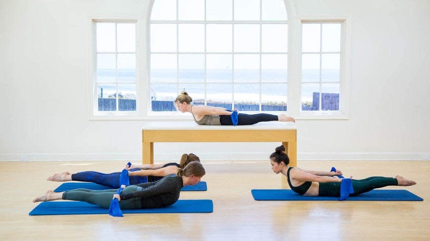I think a single leg kick set up. Yep. Okay. Palms face up. Oh boy. Let's just cheat for a sec. Let's go to the beach and just cheating. Yeah, Doug. Oh God, it's so it's right there. We used to go to the beach. All right, so we know that this is not a supported place to move from, so we'll select darn it, unless we're relaxing, but we're in a [inaudible] class, so we are going to lift our chest and lift the ribs up off the Mat and depending on your body frame and torso length and things, your pubic bone may or may not come up. Also, it's really a variable, but I do want us to think chest forward and up. Okay. Now, light grip on the band externally, rotate your shoulders and start to pull on the band. Not a lot is going to happen. You will feel some warmth around your shoulders and your upper back and then come out of that work. Breathe in less exhale and hold it for three counts.
