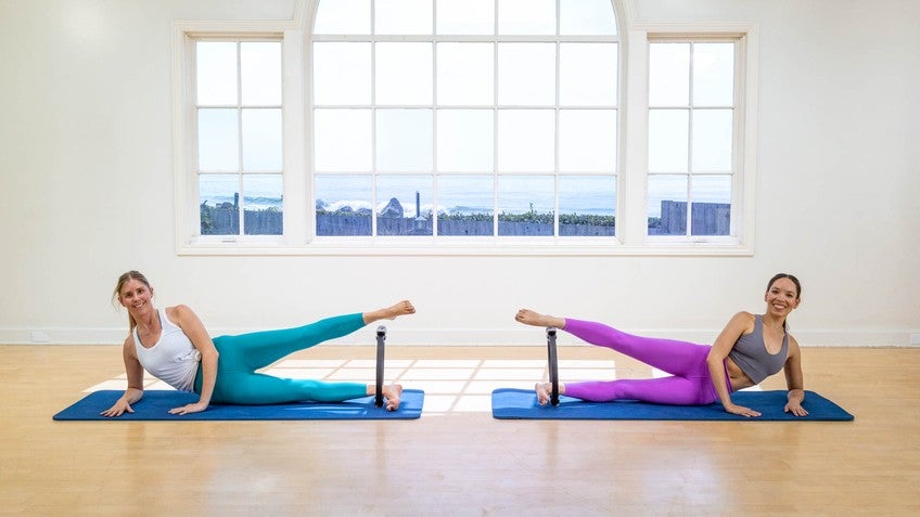 Try not to overdo it, though, so that hip doesn't roll off. You want to stay as square as you can in your pelvis. Now bring your leg back up to the ceiling. You're gonna hold the circle in both hands. Squeeze it just slightly.