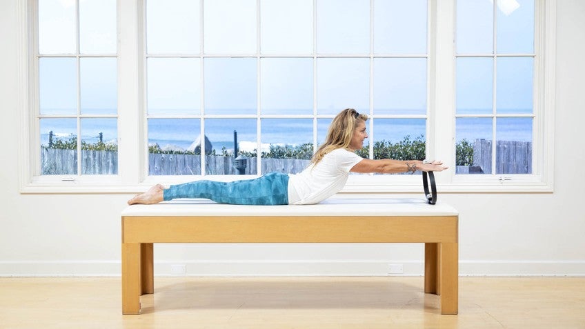 (Kristi exhales heavily) One more. I'd fall out of form, surely. Okay, relax that. We're turning over onto our bellies, for just a little single leg kick and the ring in this case, I'm just putting my elbows at the handles and squeezing a little bit, just to give me that sense of yes, I'm about to work my back body, but also want the sense of the front. Hold the ring or just let your hands be free. We are lifted, our shoulders are down.