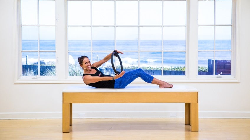And balance, and inhale, and balance, and inhale, heels into the seat, and balance, last one reach back, reach forward, take the feet into the ring, oh, I almost got it, stretch the legs out, pull the heels through, pull the back up long, stay there, take the ring, you're gonna keep the legs as they are, we're gonna roll the spine down, bend the knees and into the double leg stretch out and back, inhale, and pull, inhale, and pull, reaching out, keeping the height of the trunk, keeping the stability of the trunk, last four, feel a gentle inward press, focusing on the breath, in, out two, and one, hold it here, one leg forward, one leg right into the nose. And switch, keep the straight leg foot just up near the ring, and the bent knee foot right up near the ring as well so we use the ring to feel where we're aiming, feel that the arms are reaching for the scapula, are abducted, pulling around the sides of the body, and we go three, three, two, keeping the height, one, one, both knees in, ring comes back behind the head at the base of the skull, find a heavy head into the ring, straighten the right leg, come across, touch the right elbow, and change, elbow to knee, so that might mean the knee needs to come across the body a little bit, make it happen, breathing, trying not to pull the neck forward, so the head just is resting, and five, five, lift as you twist, and three, two, and one, bend the knees, place the head down, feet down on the mat, parallel to one another, reorganize the ring so it's back into the hands, take a breath in, and exhale, we'll roll the body up and reach the ring overhead. Staying here, lift the left leg, bring the ring and the knee together, then straighten that leg, keep the ring as it is, take that leg down, come all the way back to touch. Take the leg down, come all the way back to touch, and down, all the way back to touch, and two, last time and one, bend that knee, reach the hips up, take the arms overhead, getting ready for the other side. Lift the right knee, stabilizing the pelvis, bring the ring and the knee together, straighten that leg, now keep that ring still and just take the leg down, flex and touch, away, flex and back, away, good, last two, one more, oh, and bend that knee, lift the hips as you stretch the arms, over your head, and then roll the spine all the way down, sending those arms long overhead, as the hips come down we'll stretch the legs out, we'll lift the body up, and we'll roll all the way back up again, flex the feet, hook the ring around your feet and stretch forward.