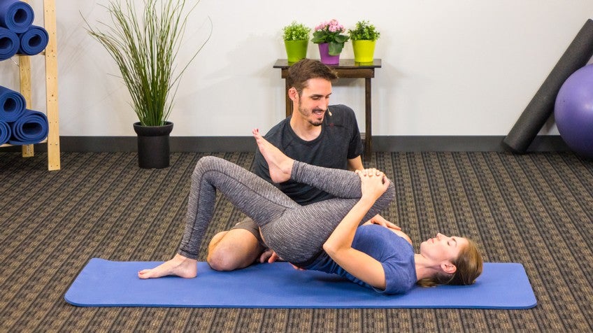So the way our tissues communicates with our brain and the brain with our tissues changes. So it's a very good tool to recover this, to use the, the [inaudible] method and the exercise in order to facilitate the good functioning of the, of the system. So first we need to understand how is the this low back working. So we are going to do a very easy assessment with Christina. So Hi Christina. What I wanted to do is just to lift this knee up like that exercise.