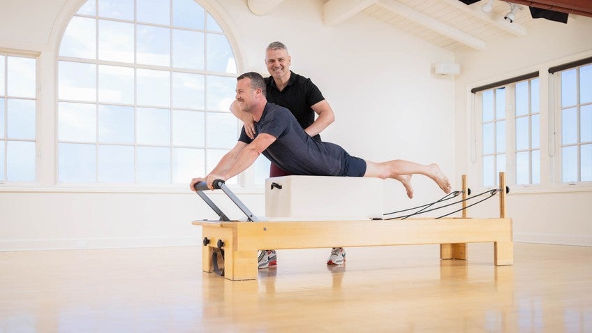 Hello everybody, my name is Andrew Aroustian, and thank you for joining us for a Men's Health Reformer Class. Helping me today, I have Michael. Thank you so much for joining us. Now, I'm gonna get the reformer set up for you to begin with. So with this class, I'm gonna set up the reformer here with a long box on.