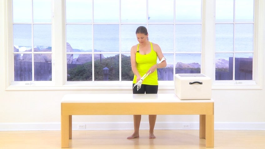 If you have a really luxurious, soft, thick mat, the heels of your hands are going to sink down. So that might not be the best option. So you wanna just take a look, take a look at that and that will help you. Um, sometimes it seems strange, but a hard surface, a hard floor is actually more comfortable because you can get that support. Uh, what you have on the apparatus when you're using the apparatus is, especially on the foot bar, you have the capacity to move your hand all around the foot bar. So make sure you're not setting your hand up on the foot bar where it's low, your wrist is low, get your hand up on top. And again, if you send your fingers out, you spread them out in that direction. Again, you're going to start to get that Koch contraction around your forearm, less pain, less discomfort. One more thing you can try for this. If you have a box or you have something at home that is around this height, could be anything even a footstool. You can take this and you can place your forms on it.