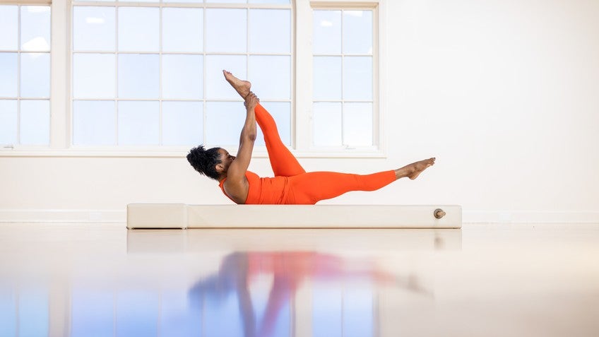 Slide your legs together and then bend your knees into your Pilates stance. Hold onto the tops of your ankles. As you push your feet down, grow taller. Find your internal lift and a pelvic tilt. Lift your spine and lift your feet up off the floor.