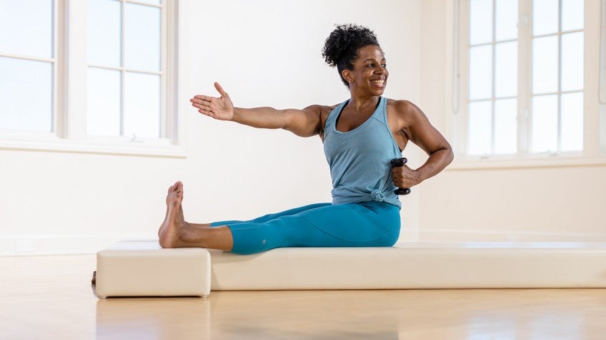 Reach your arms forward the heads of the dumbbells are resting on their sides. Feel like you're squeezing your sit bones, inner thighs, and inner ankles together. Find your internal lift. Pull your lower abdominals back and lift them up the back of your ribs. As you exhale, reach your arms forward.