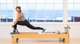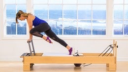 And one. Now let's go down and pause. Now here, we're doing our reformer mid range work. So this is where the intensity goes up. Lower the body down an inch, and lift up an inch.