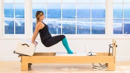 Exhale, there's a combination of arms and abs to get back up. Inhale, exhale. This is a short box series that we do on the reformer. Think of it as a flat back hinge, and exhale. Scoop to come up.