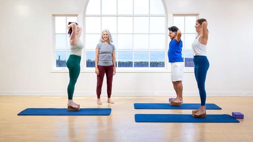 (blocks thud) Great. So in gait patterning, right, there are times when your one leg is in flexion and, Johnny, I'm gonna ask you to try to feel the inside of your feet more, that's all. So you don't feel the outside of your feet, that's perfect. In gait patterning, you know, we have one hip that's flexing and one hip that's extending. And this is what we're kinda creating here with the blocks.