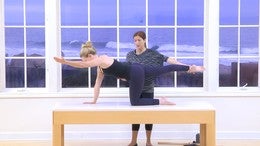 And then, um, when you start to introduce more loaded flection, very gently with the seated bent knee position with springs to assist, really helpful there. And then, um, get going to the full straight leg roll up and wrote down, which should probably, it may be a long time before they start to do the full spine stretch forward while you're sitting and stretching forward. Um, so go ahead and roll up Amy, uh, with the hands behind your thighs and uh Huh. Okay. She doesn't have a lot of Lumbar flection, so that's really hard for her. Yeah, that was good. All right now, so straighten your legs out, reach your arms straight out. So one thing I love about the springs is that it gives her a little bit of assistance with that position or the push three bar. Super helpful with introducing some flection and then back up again.