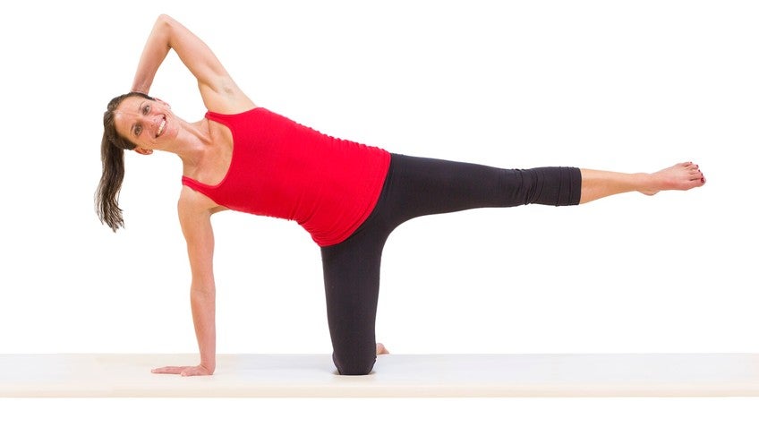 The knee and foot are straight in alignment. And here's the hardest part. You're going to want to have the hip right over the knee, so you have to really engage that hamstring glute and have a, again, flexible hip flexor. Let's put the left hand behind your head and that adds extra lengths. So you're going to be pushing your head into your hand and lengthening your spine from your powerhouse. Finally, let's lift the leg up to hip height, but when you lift it, you want to feel as if someone is Ooh, rolling in the opposite direction, pulling your belly in and up.