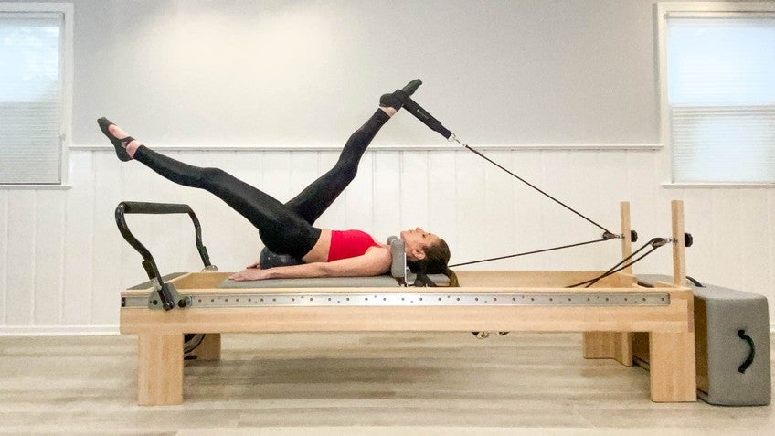 I might go one more. So I'm gonna go down to about there. Now, I'm gonna start kind of scooted over to the side, because I want my left foot to be able to be up in the air and my right foot to be up against the shoulder rest. And I'm gonna bring my right hand onto the foot bar and my left hand onto the carriage. And then I'm gonna extend my left leg back.
