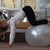 We'll do four more. One, two, three, and four. I promised you we were gonna sit on the ball again, and we're gonna do that now. So we're gonna take the ball. You're gonna lift your hips up.