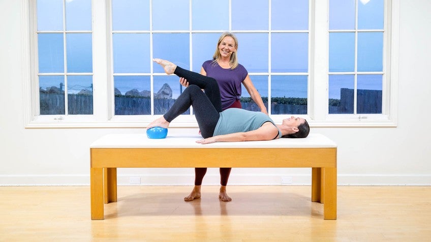 (Anne inhaling) And you wanna make sure that when you're breathing, everything's engaging, but that there's no constriction and there's no shortening anywhere, right? So the hips stay nice and long. You're just pressing into the ball with the whole foot. Really activates the backs of the thighs. Last one.
