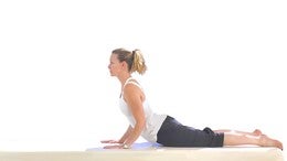 The next exercise is called Swan dive. It takes a lot of back muscle control. It opens up the chest to create an atmosphere of exhilaration and excitement. Obviously it's an advanced exercise. So to go through the basic mechanics of it, first of all, Christie's got her hands right on the side of her head a little bit wide. Now pull the stomach in and up and press down with the hands to lift your chest up, opening the chest out, pulling the shoulder blades down your back and make sure that you're tightening the muscles. So from your heels up through the crown of your head, you're in a locked position.