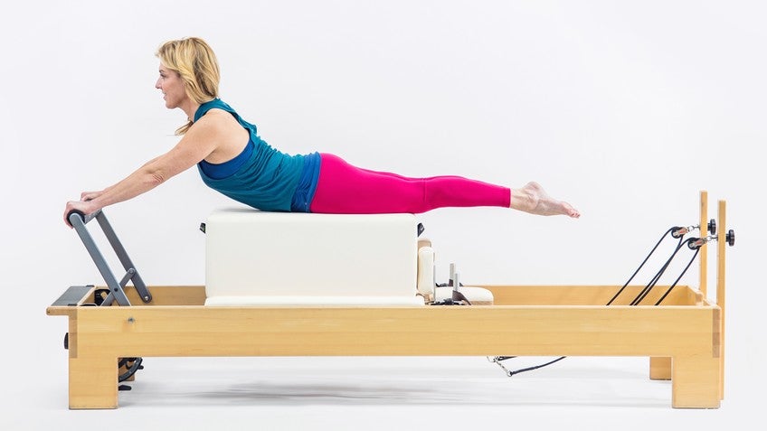 The legs are energized and reaching not higher than the box, but level to the box so that there's just some energy in the hip extensors. So as we prepare to move, the scapula glides down and it's as the result of that glide in the scapula that the arms straighten. As the arms straighten, you'll see the wrists turn, so now they're again in line with the elbows. So we started with them a little cocked, now they're straight. We then lift the eyes, the gaze, and then the mid back starts to lift and we keep the arms straight to bring the carriage in.