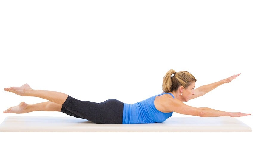 Could you demonstrate doing it badly where everything is flopping in the shoulder? That's it. Where the, she's wobbling all over the place. No good and relaxed down. It's exhausting to do it badly. The other thing is often the most advanced version is with the feet together. That can create a pinch in the lower back, a way to work it more simply as with the leg, slightly to the side separated, and then lift up. One more time. She's anchoring hips and shoulders, and then she goes for the swimming. Yes, without the center. Waste of waste and rib cage moving, so it's all isolating the legs and stabilizing the center and then relaxed out.